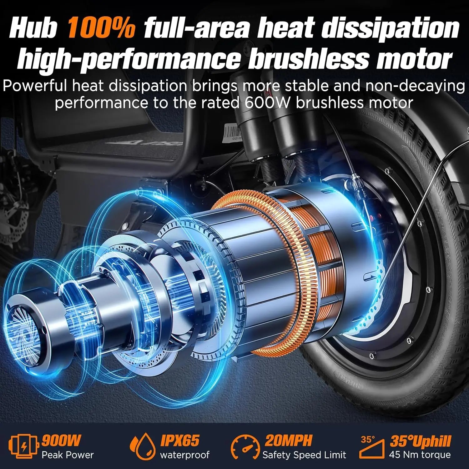 - Power and performance: Brushless motor with up to 900W peak power delivers 30–50 km/h, smooth acceleration, and confident climbs on city streets.